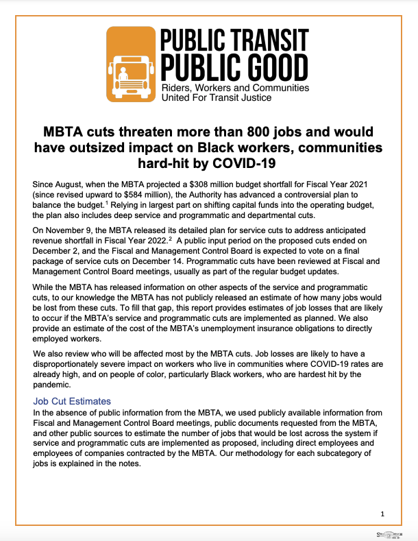 MBTA Cuts Threaten More than 800 Jobs and Would Have Outsized Impact on Black Workers, Communities Hard-hit by COVID-19